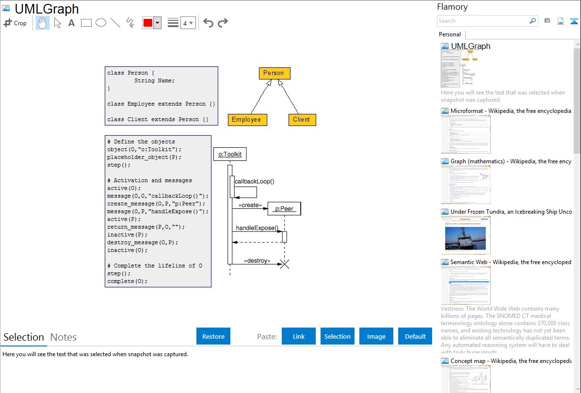 Flamory helps you capture and store screenshots from UMLGraph by pressing a single hotkey. It will be saved to a history, so you can continue doing your tasks without interruptions. Later, you can edit the screenshot: crop, resize, add labels and highlights. After that, you can paste the screenshot into any other document or e-mail message.