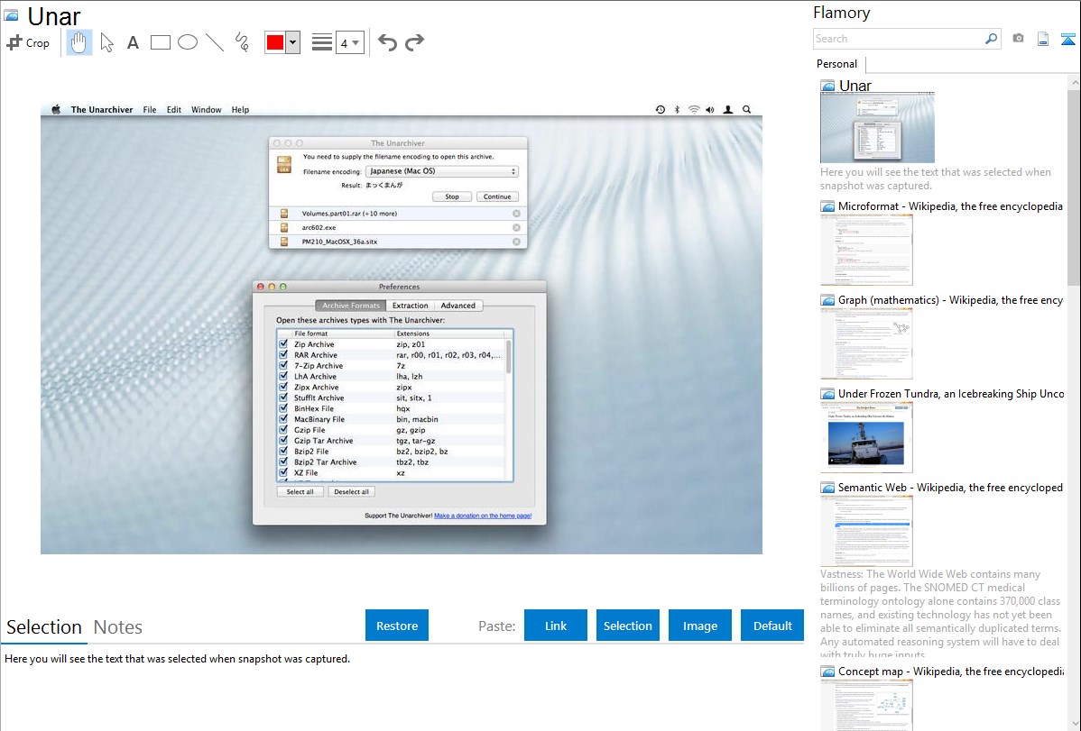 Flamory helps you capture and store screenshots from Unar by pressing a single hotkey. It will be saved to a history, so you can continue doing your tasks without interruptions. Later, you can edit the screenshot: crop, resize, add labels and highlights. After that, you can paste the screenshot into any other document or e-mail message.