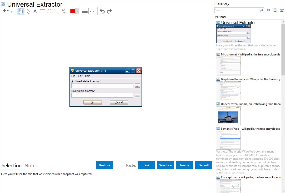 Flamory helps you capture and store screenshots from Universal Extractor by pressing a single hotkey. It will be saved to a history, so you can continue doing your tasks without interruptions. Later, you can edit the screenshot: crop, resize, add labels and highlights. After that, you can paste the screenshot into any other document or e-mail message.