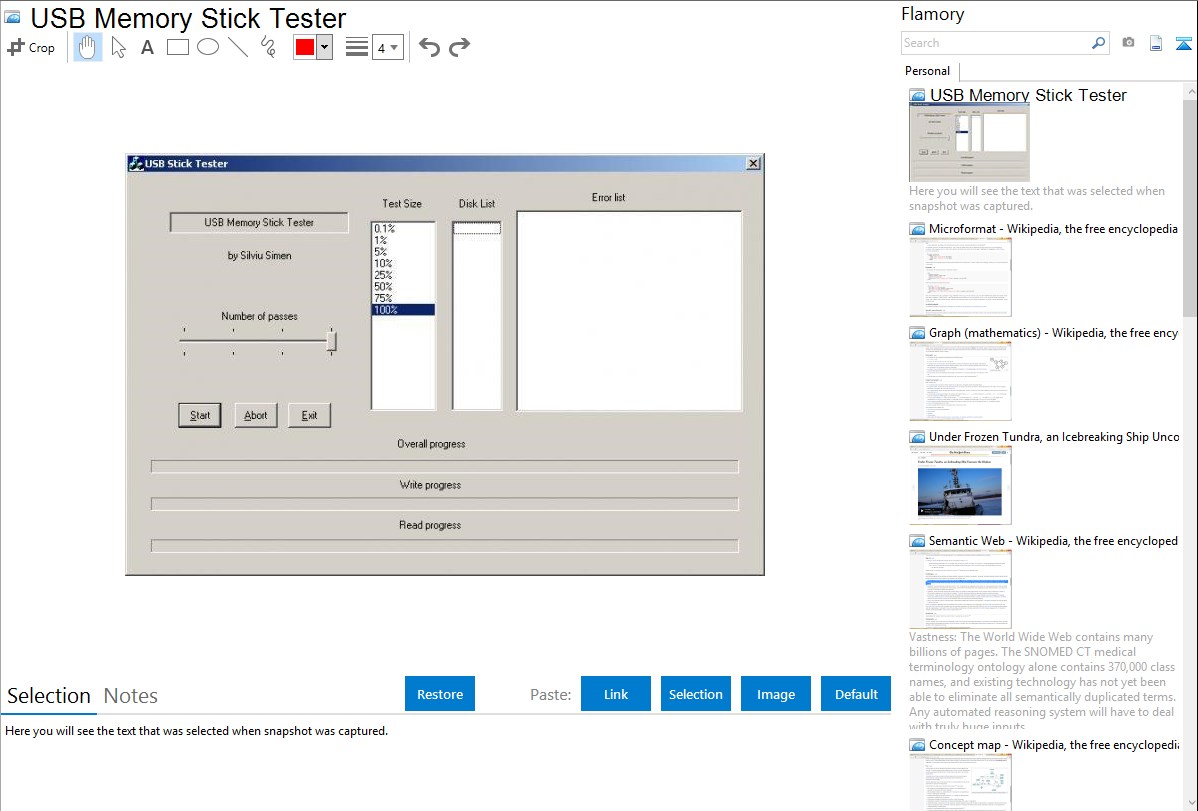 Flamory helps you capture and store screenshots from USB Memory Stick Tester by pressing a single hotkey. It will be saved to a history, so you can continue doing your tasks without interruptions. Later, you can edit the screenshot: crop, resize, add labels and highlights. After that, you can paste the screenshot into any other document or e-mail message.