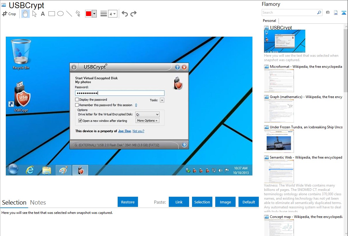 Flamory helps you capture and store screenshots from USBCrypt by pressing a single hotkey. It will be saved to a history, so you can continue doing your tasks without interruptions. Later, you can edit the screenshot: crop, resize, add labels and highlights. After that, you can paste the screenshot into any other document or e-mail message.