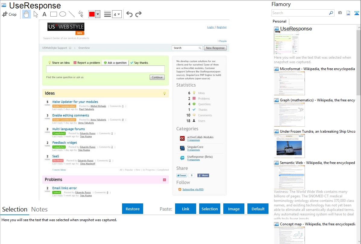 Flamory helps you capture and store screenshots from UseResponse by pressing a single hotkey. It will be saved to a history, so you can continue doing your tasks without interruptions. Later, you can edit the screenshot: crop, resize, add labels and highlights. After that, you can paste the screenshot into any other document or e-mail message.
