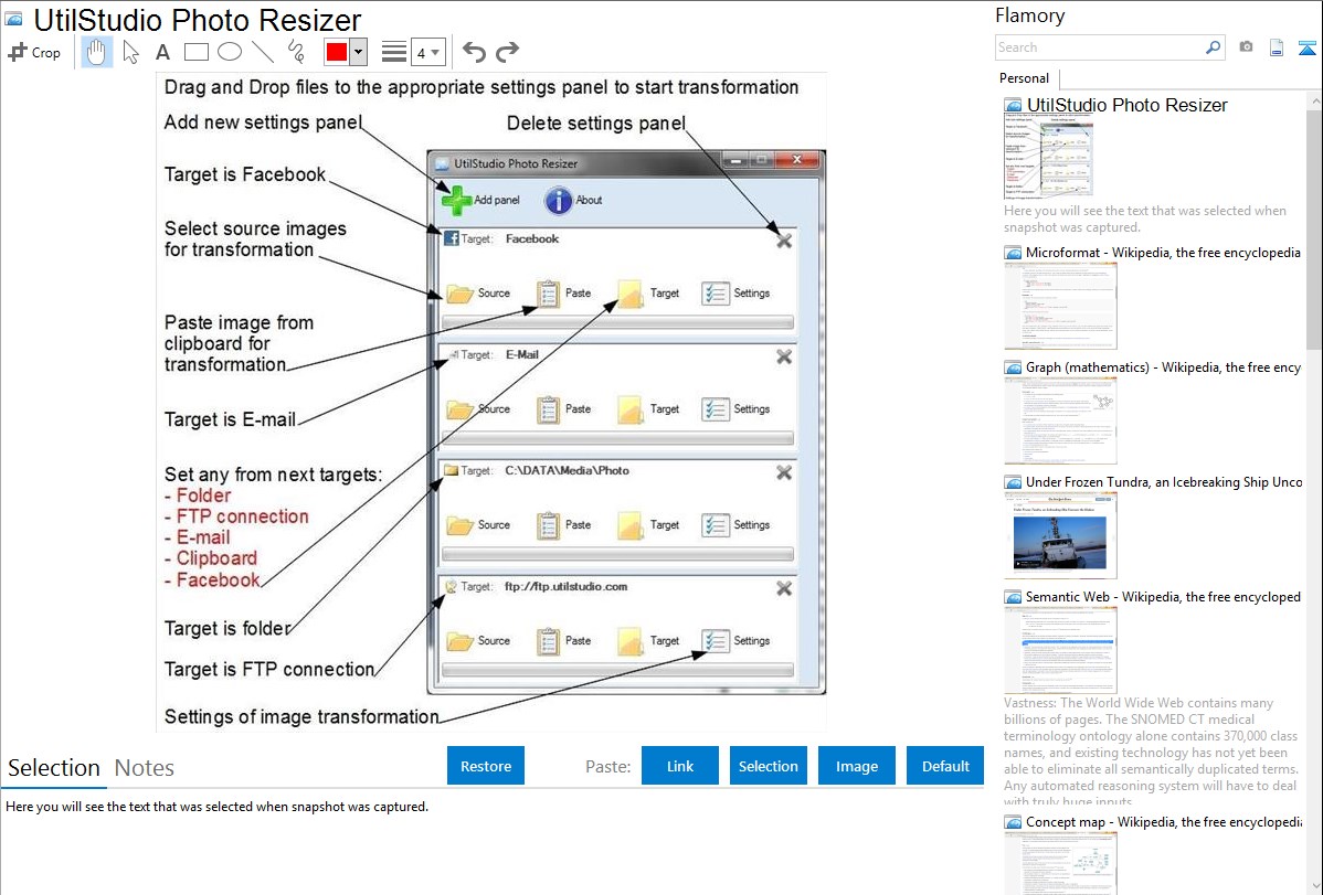 Flamory helps you capture and store screenshots from UtilStudio Photo Resizer by pressing a single hotkey. It will be saved to a history, so you can continue doing your tasks without interruptions. Later, you can edit the screenshot: crop, resize, add labels and highlights. After that, you can paste the screenshot into any other document or e-mail message.