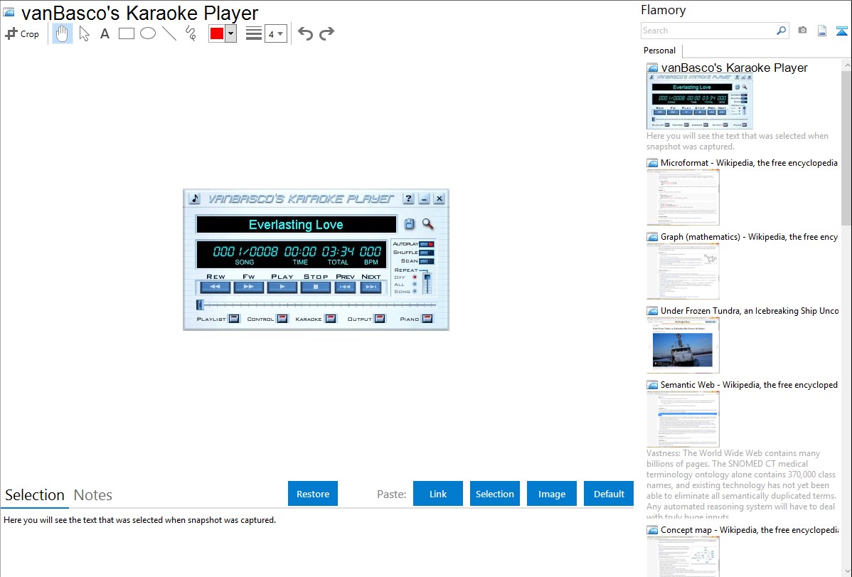 Flamory helps you capture and store screenshots from vanBasco's Karaoke Player by pressing a single hotkey. It will be saved to a history, so you can continue doing your tasks without interruptions. Later, you can edit the screenshot: crop, resize, add labels and highlights. After that, you can paste the screenshot into any other document or e-mail message.