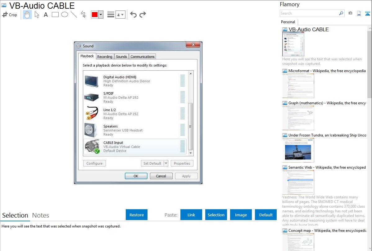 Flamory helps you capture and store screenshots from VB-Audio CABLE by pressing a single hotkey. It will be saved to a history, so you can continue doing your tasks without interruptions. Later, you can edit the screenshot: crop, resize, add labels and highlights. After that, you can paste the screenshot into any other document or e-mail message.