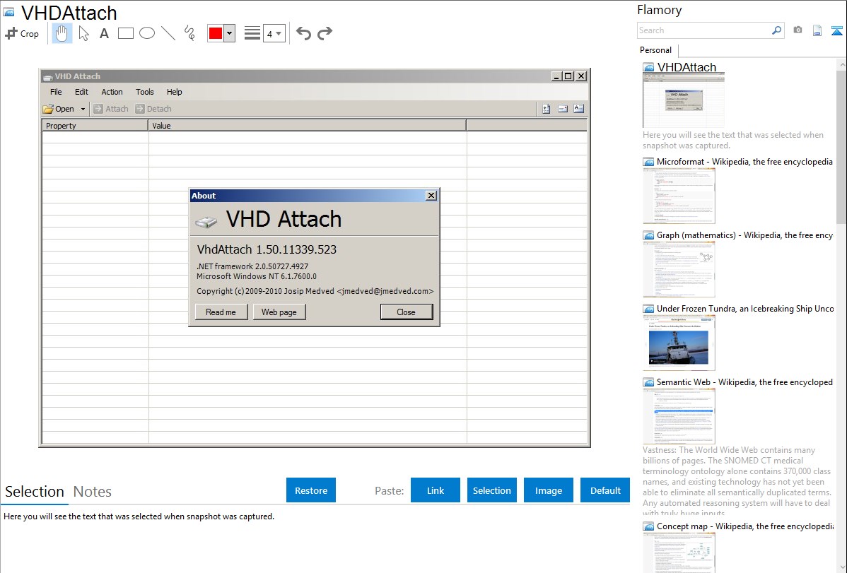 Flamory helps you capture and store screenshots from VHDAttach by pressing a single hotkey. It will be saved to a history, so you can continue doing your tasks without interruptions. Later, you can edit the screenshot: crop, resize, add labels and highlights. After that, you can paste the screenshot into any other document or e-mail message.