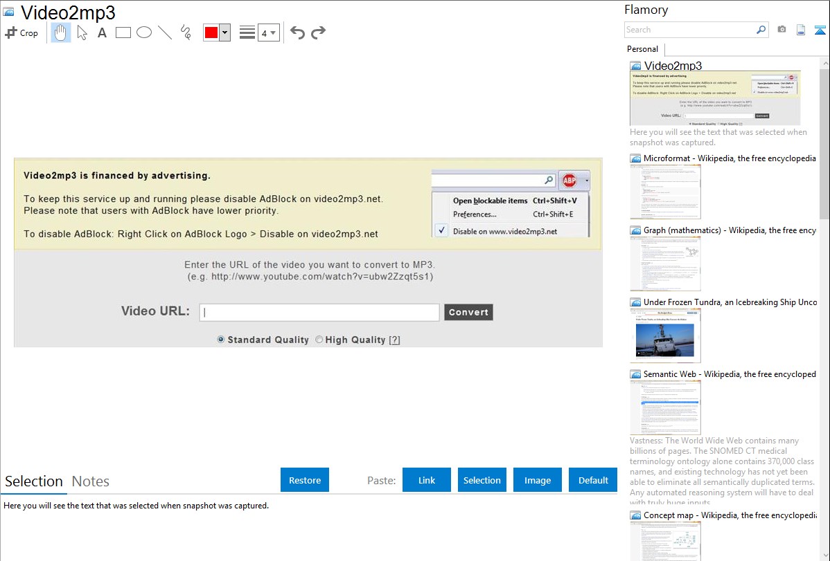 Flamory provides advanced bookmarking for Video2mp3. It captures screen, selection, text on the page and other context. You can find this bookmark later using search by page content or looking through thumbnail list.
