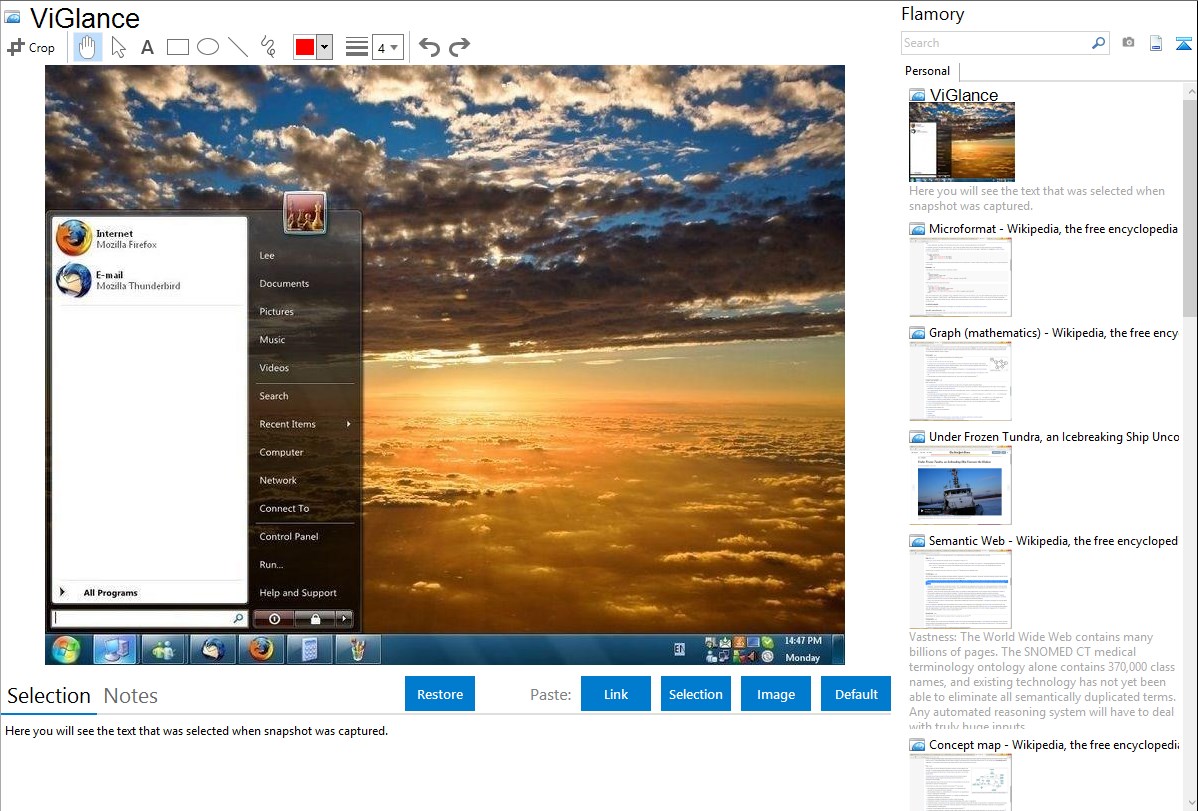 Flamory helps you capture and store screenshots from ViGlance by pressing a single hotkey. It will be saved to a history, so you can continue doing your tasks without interruptions. Later, you can edit the screenshot: crop, resize, add labels and highlights. After that, you can paste the screenshot into any other document or e-mail message.