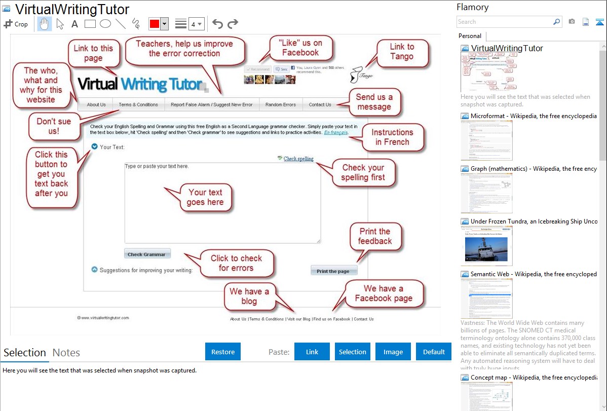 Flamory provides advanced bookmarking for VirtualWritingTutor. It captures screen, selection, text on the page and other context. You can find this bookmark later using search by page content or looking through thumbnail list.