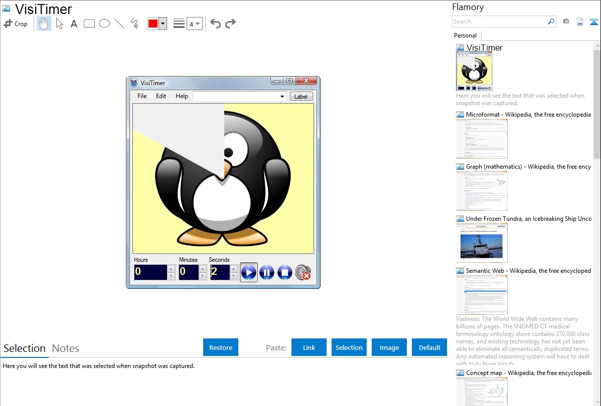 Flamory helps you capture and store screenshots from VisiTimer by pressing a single hotkey. It will be saved to a history, so you can continue doing your tasks without interruptions. Later, you can edit the screenshot: crop, resize, add labels and highlights. After that, you can paste the screenshot into any other document or e-mail message.