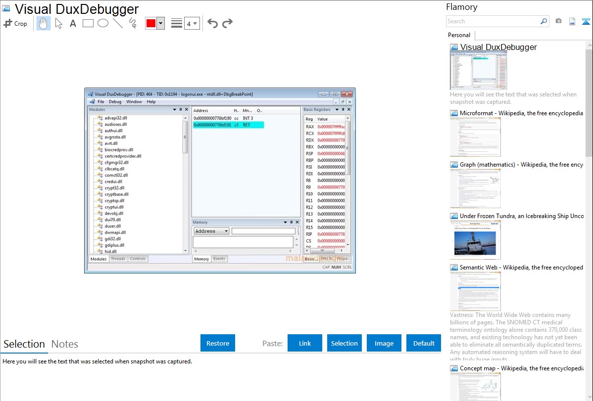 Flamory helps you capture and store screenshots from Visual DuxDebugger by pressing a single hotkey. It will be saved to a history, so you can continue doing your tasks without interruptions. Later, you can edit the screenshot: crop, resize, add labels and highlights. After that, you can paste the screenshot into any other document or e-mail message.