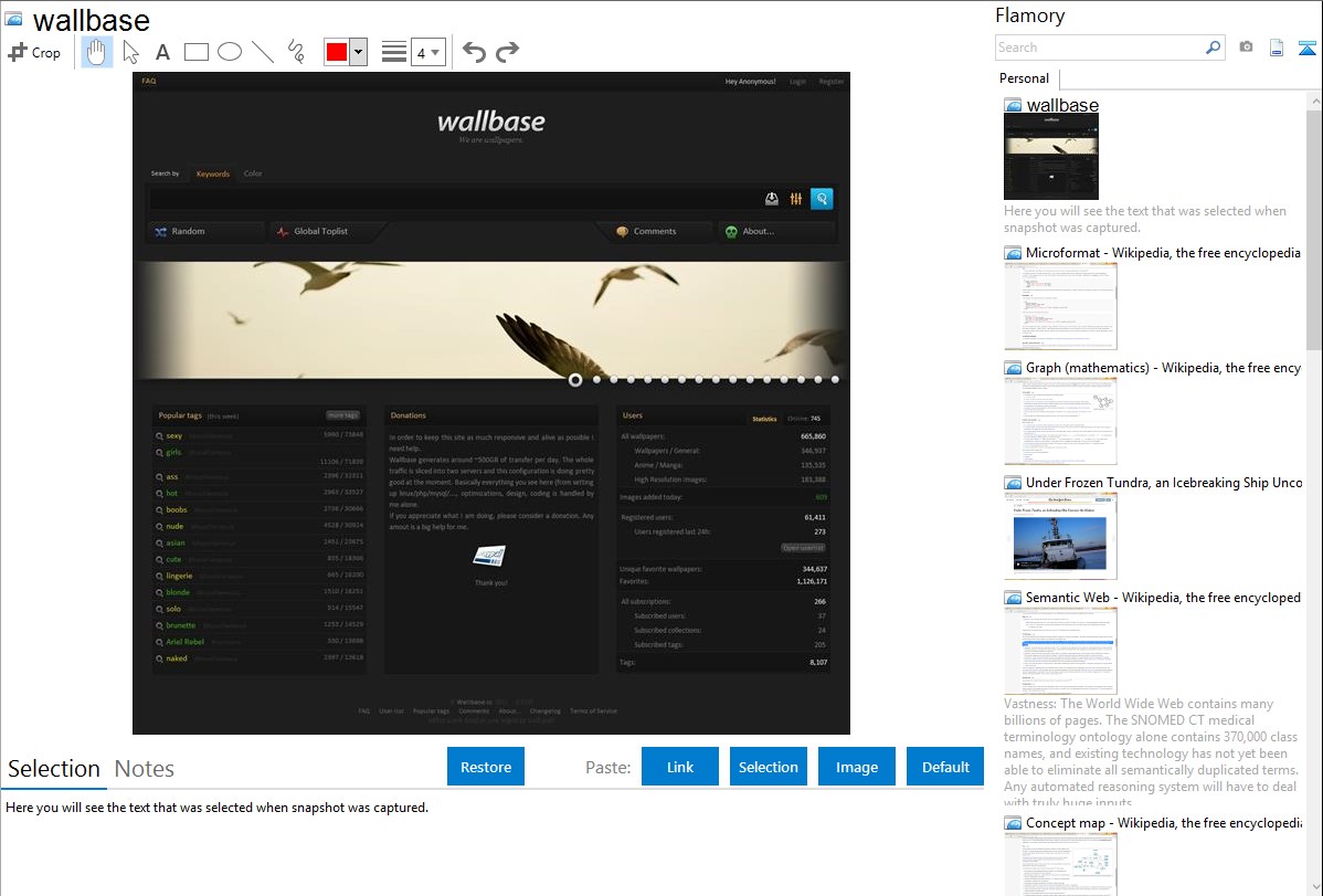 Flamory helps you capture and store screenshots from wallbase by pressing a single hotkey. It will be saved to a history, so you can continue doing your tasks without interruptions. Later, you can edit the screenshot: crop, resize, add labels and highlights. After that, you can paste the screenshot into any other document or e-mail message.