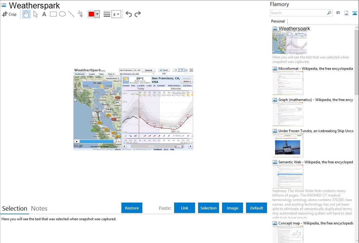 Flamory helps you capture and store screenshots from Weatherspark by pressing a single hotkey. It will be saved to a history, so you can continue doing your tasks without interruptions. Later, you can edit the screenshot: crop, resize, add labels and highlights. After that, you can paste the screenshot into any other document or e-mail message.
