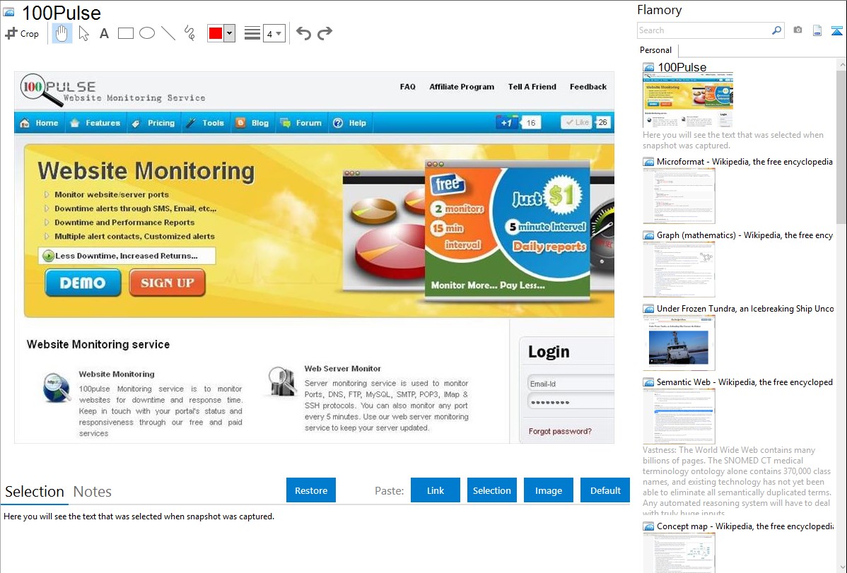Flamory helps you capture and store screenshots from 100Pulse by pressing a single hotkey. It will be saved to a history, so you can continue doing your tasks without interruptions. Later, you can edit the screenshot: crop, resize, add labels and highlights. After that, you can paste the screenshot into any other document or e-mail message.