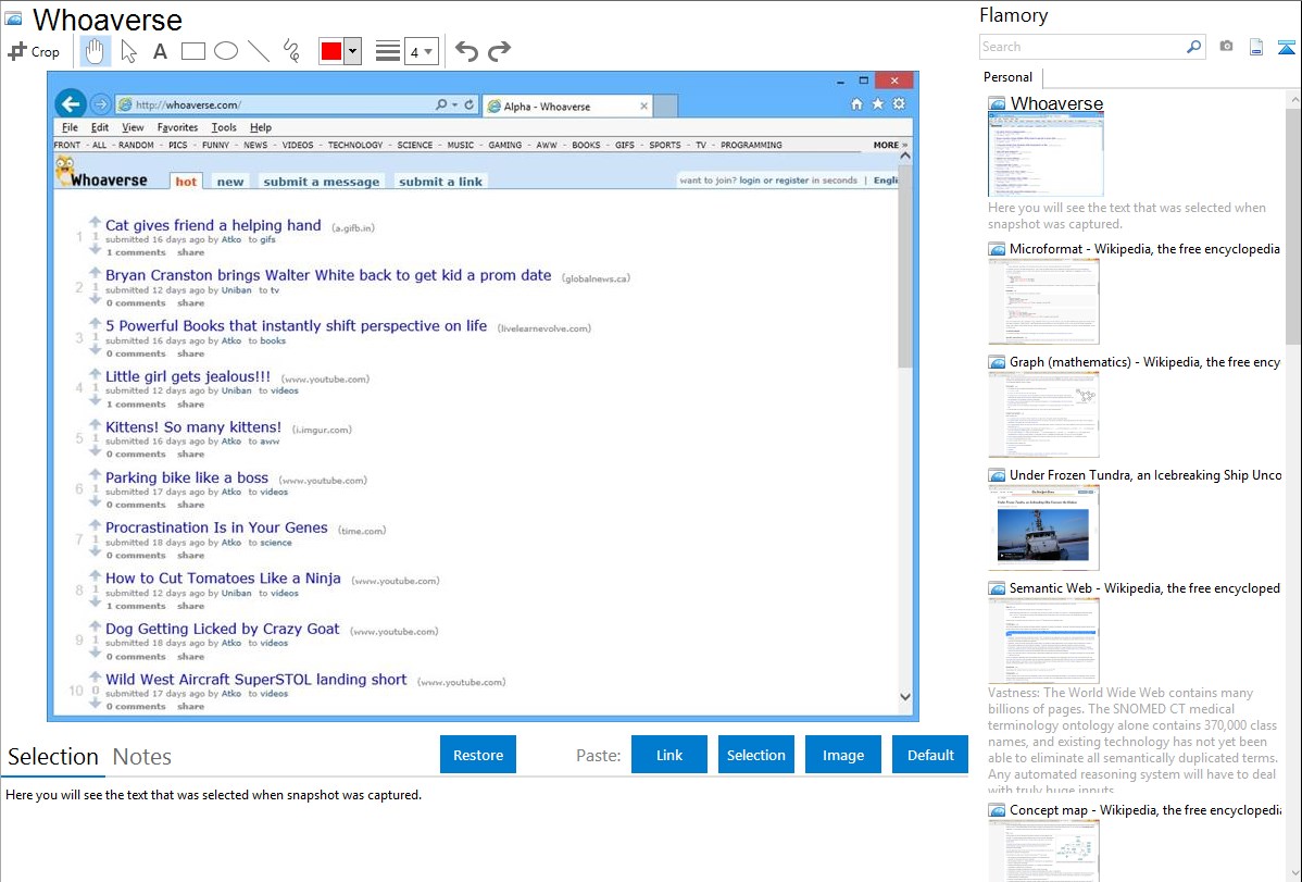 Flamory helps you capture and store screenshots from Whoaverse by pressing a single hotkey. It will be saved to a history, so you can continue doing your tasks without interruptions. Later, you can edit the screenshot: crop, resize, add labels and highlights. After that, you can paste the screenshot into any other document or e-mail message.