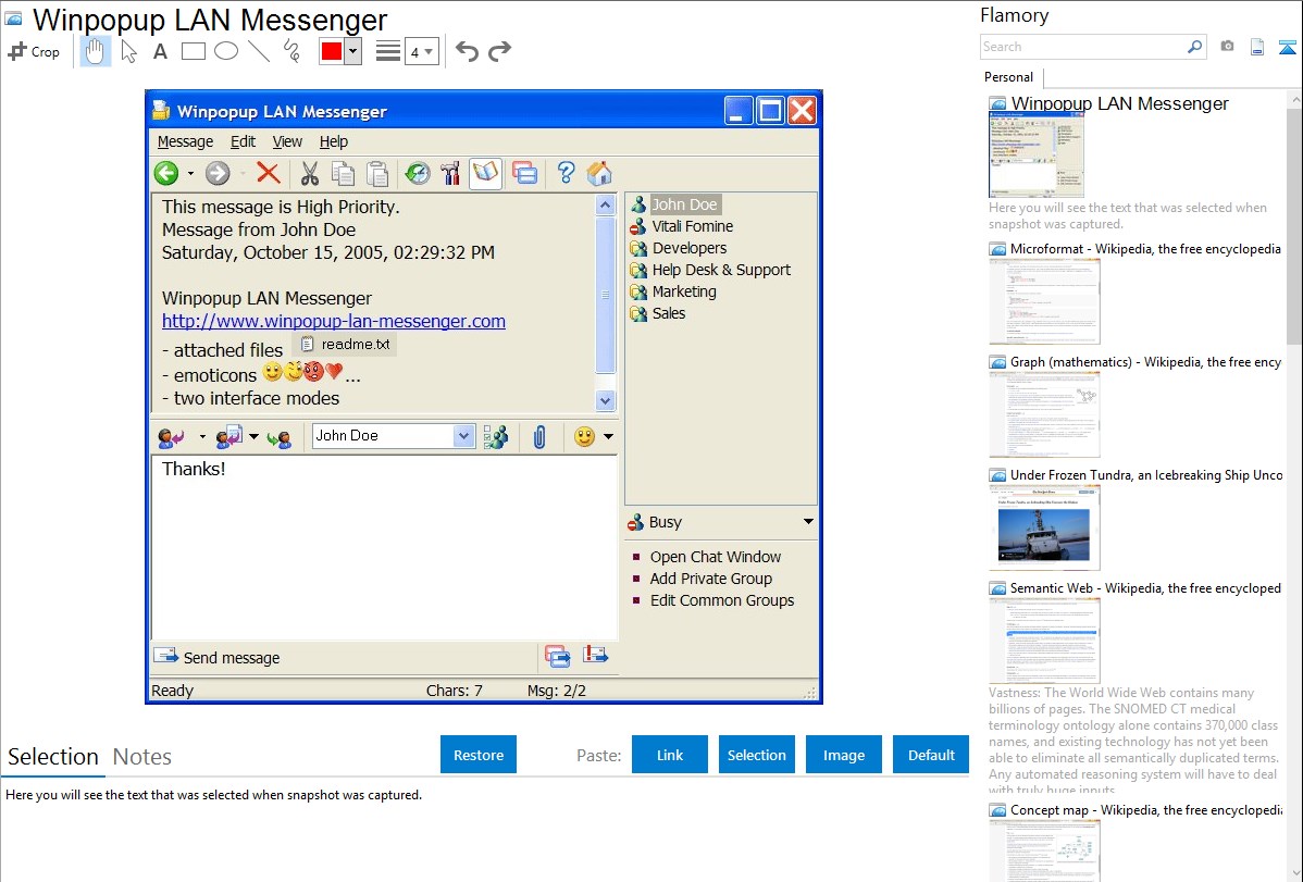 Flamory helps you capture and store screenshots from Winpopup LAN Messenger by pressing a single hotkey. It will be saved to a history, so you can continue doing your tasks without interruptions. Later, you can edit the screenshot: crop, resize, add labels and highlights. After that, you can paste the screenshot into any other document or e-mail message.