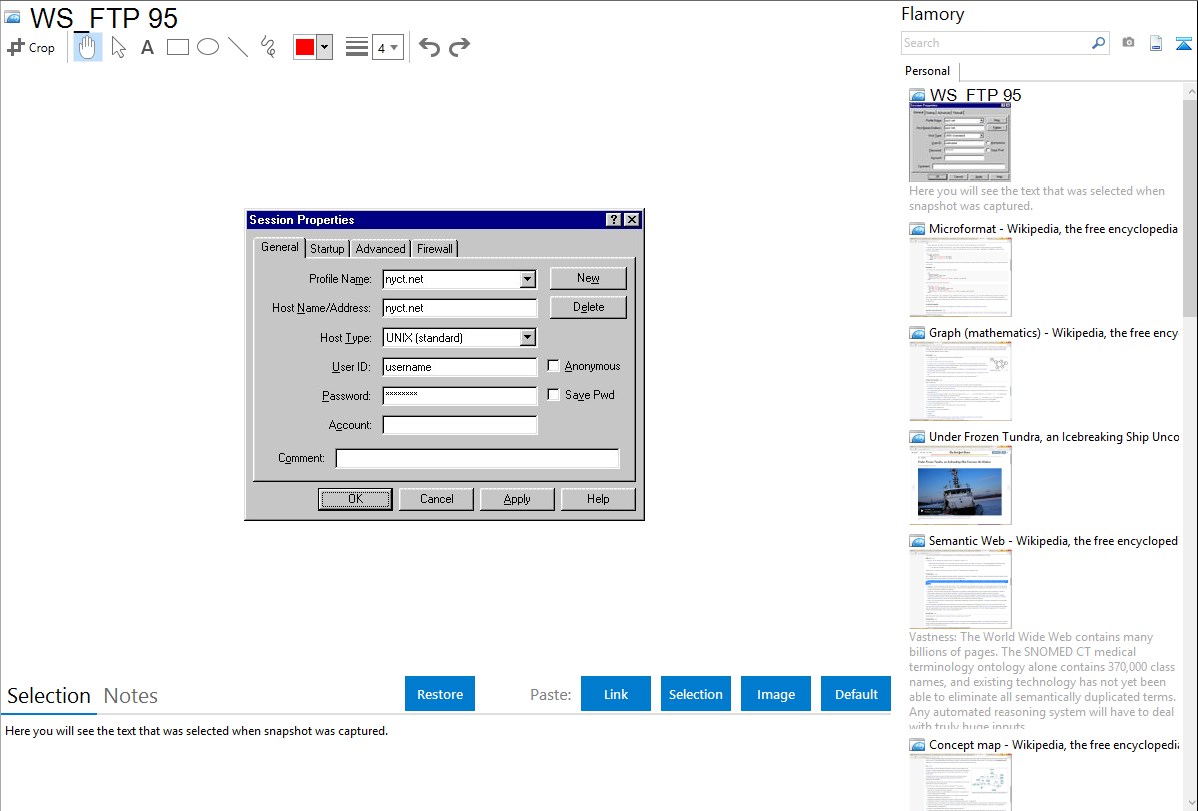 Flamory helps you capture and store screenshots from WS_FTP 95 by pressing a single hotkey. It will be saved to a history, so you can continue doing your tasks without interruptions. Later, you can edit the screenshot: crop, resize, add labels and highlights. After that, you can paste the screenshot into any other document or e-mail message.