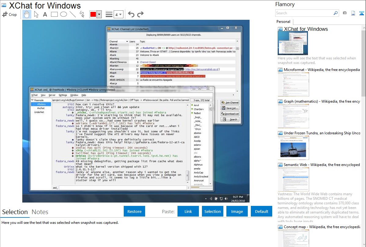 Flamory helps you capture and store screenshots from XChat for Windows by pressing a single hotkey. It will be saved to a history, so you can continue doing your tasks without interruptions. Later, you can edit the screenshot: crop, resize, add labels and highlights. After that, you can paste the screenshot into any other document or e-mail message.