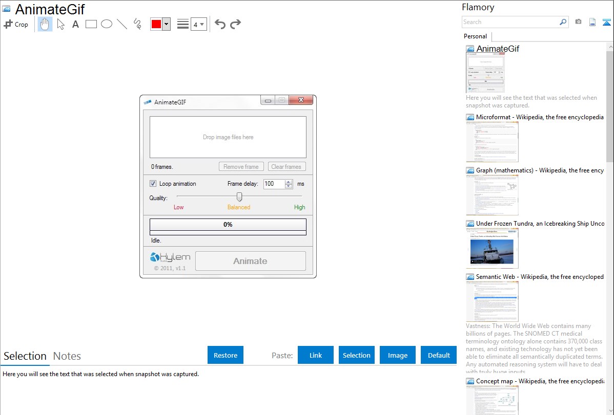 Flamory helps you capture and store screenshots from AnimateGif by pressing a single hotkey. It will be saved to a history, so you can continue doing your tasks without interruptions. Later, you can edit the screenshot: crop, resize, add labels and highlights. After that, you can paste the screenshot into any other document or e-mail message.