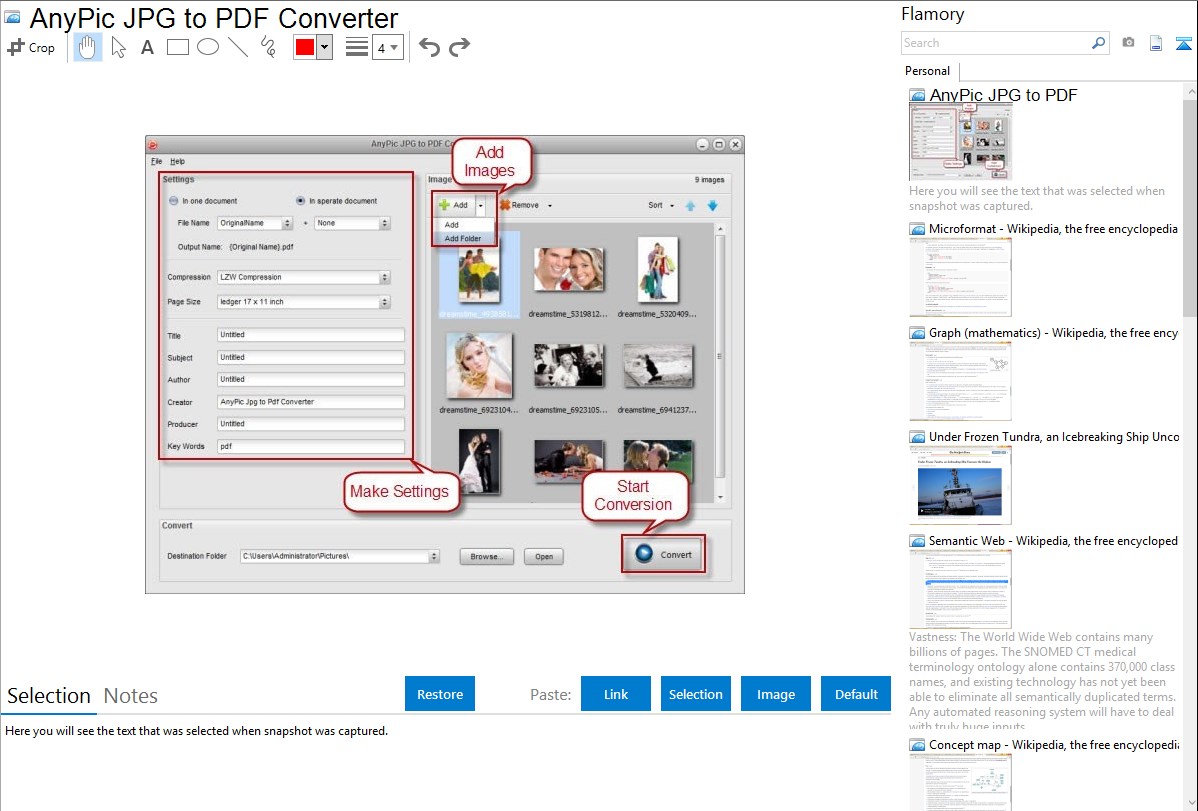 Flamory helps you capture and store screenshots from AnyPic JPG to PDF Converter by pressing a single hotkey. It will be saved to a history, so you can continue doing your tasks without interruptions. Later, you can edit the screenshot: crop, resize, add labels and highlights. After that, you can paste the screenshot into any other document or e-mail message.