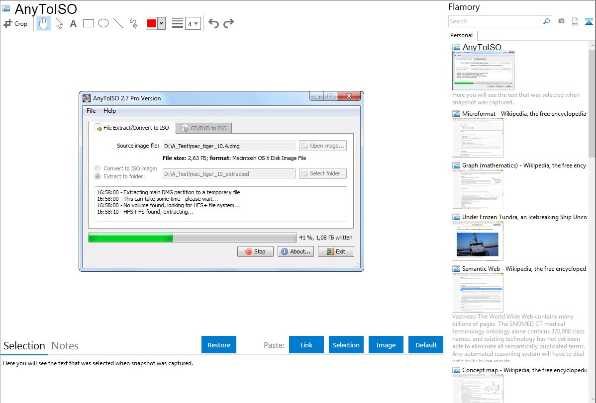 Flamory helps you capture and store screenshots from AnyToISO by pressing a single hotkey. It will be saved to a history, so you can continue doing your tasks without interruptions. Later, you can edit the screenshot: crop, resize, add labels and highlights. After that, you can paste the screenshot into any other document or e-mail message.