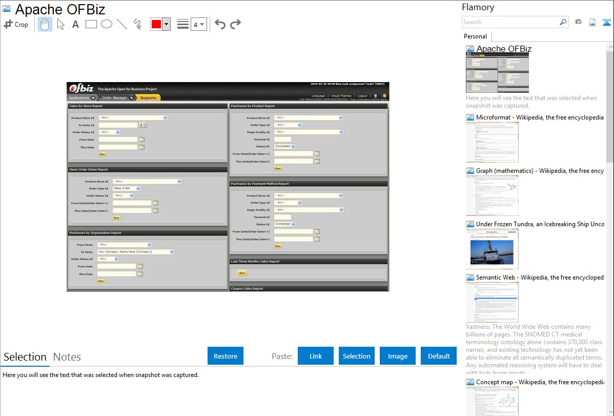 Flamory helps you capture and store screenshots from Apache OFBiz by pressing a single hotkey. It will be saved to a history, so you can continue doing your tasks without interruptions. Later, you can edit the screenshot: crop, resize, add labels and highlights. After that, you can paste the screenshot into any other document or e-mail message.