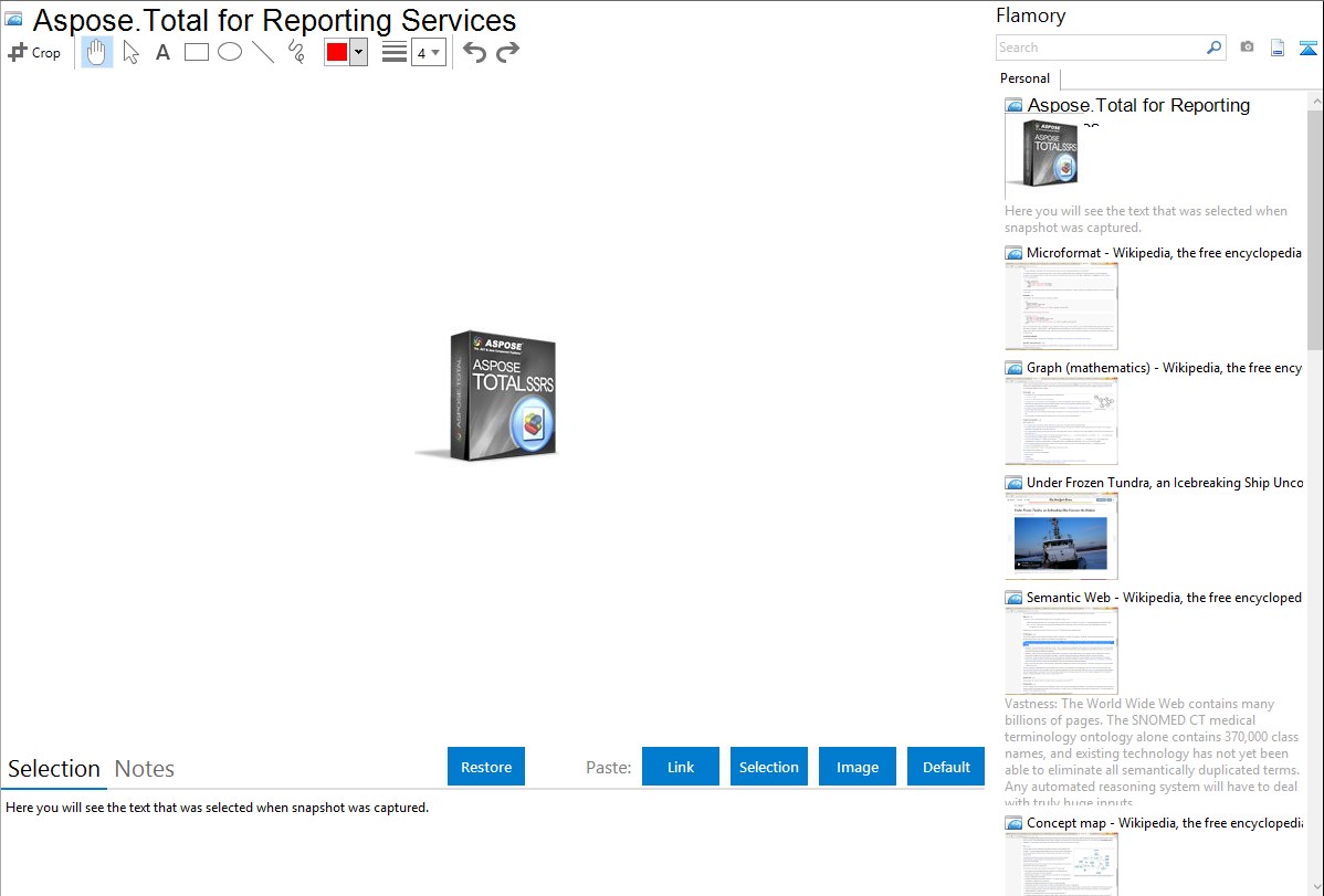 Flamory helps you capture and store screenshots from Aspose.Total for Reporting Services by pressing a single hotkey. It will be saved to a history, so you can continue doing your tasks without interruptions. Later, you can edit the screenshot: crop, resize, add labels and highlights. After that, you can paste the screenshot into any other document or e-mail message.