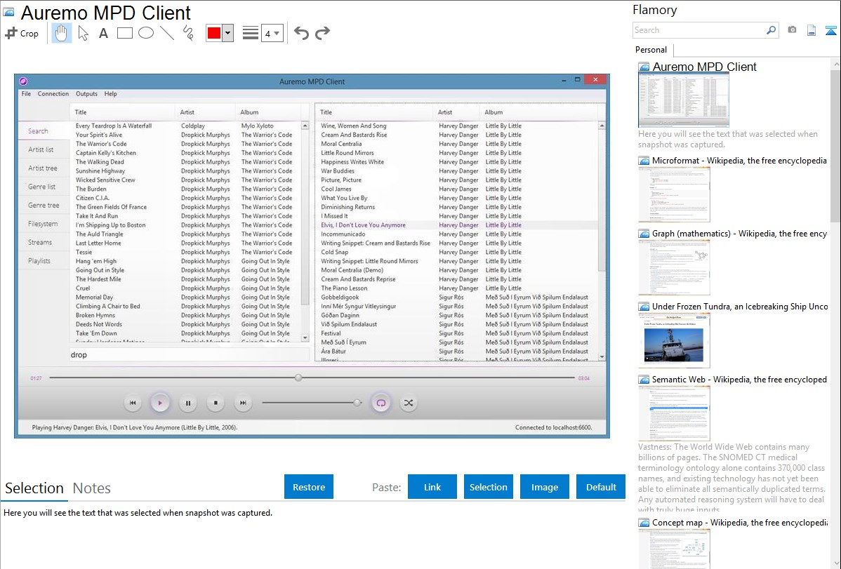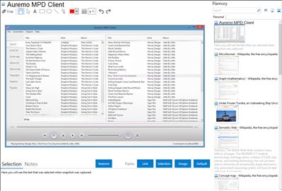 Flamory helps you capture and store screenshots from Auremo MPD Client by pressing a single hotkey. It will be saved to a history, so you can continue doing your tasks without interruptions. Later, you can edit the screenshot: crop, resize, add labels and highlights. After that, you can paste the screenshot into any other document or e-mail message.