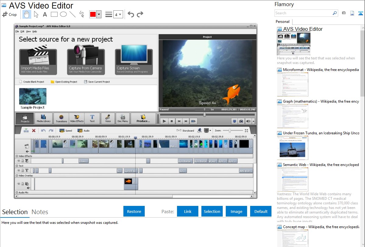 Flamory helps you capture and store screenshots from AVS Video Editor by pressing a single hotkey. It will be saved to a history, so you can continue doing your tasks without interruptions. Later, you can edit the screenshot: crop, resize, add labels and highlights. After that, you can paste the screenshot into any other document or e-mail message.