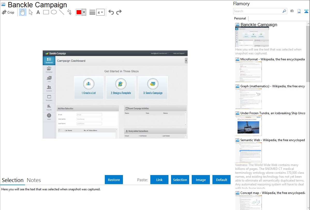 Flamory helps you capture and store screenshots from Banckle Campaign by pressing a single hotkey. It will be saved to a history, so you can continue doing your tasks without interruptions. Later, you can edit the screenshot: crop, resize, add labels and highlights. After that, you can paste the screenshot into any other document or e-mail message.