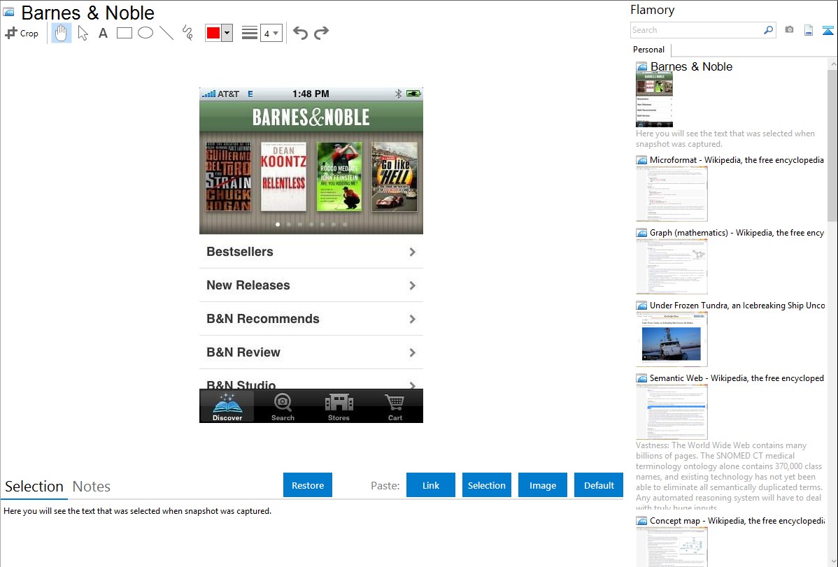 Flamory helps you capture and store screenshots from Barnes & Noble by pressing a single hotkey. It will be saved to a history, so you can continue doing your tasks without interruptions. Later, you can edit the screenshot: crop, resize, add labels and highlights. After that, you can paste the screenshot into any other document or e-mail message.