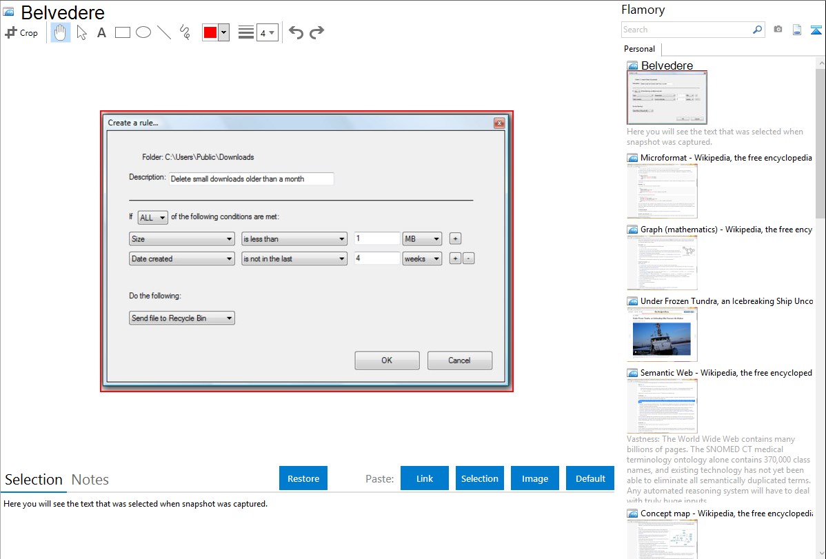 Flamory helps you capture and store screenshots from Belvedere by pressing a single hotkey. It will be saved to a history, so you can continue doing your tasks without interruptions. Later, you can edit the screenshot: crop, resize, add labels and highlights. After that, you can paste the screenshot into any other document or e-mail message.