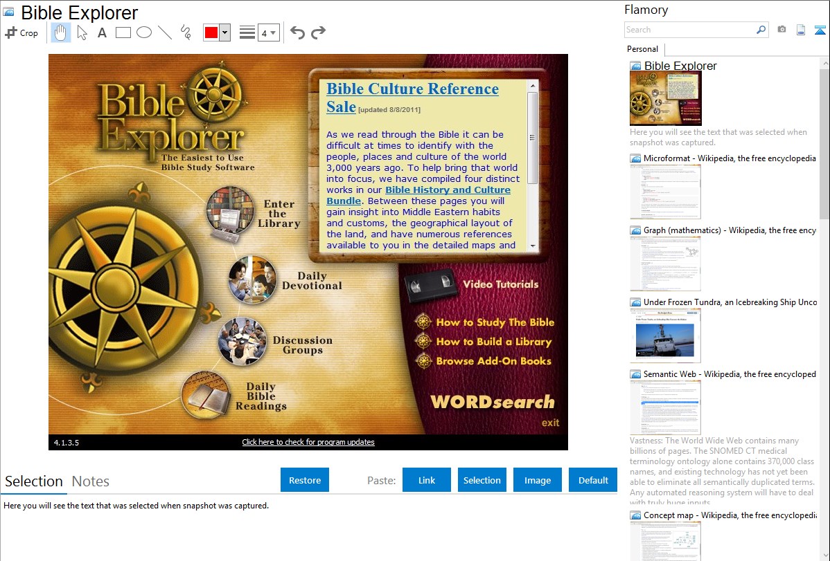 Flamory helps you capture and store screenshots from Bible Explorer by pressing a single hotkey. It will be saved to a history, so you can continue doing your tasks without interruptions. Later, you can edit the screenshot: crop, resize, add labels and highlights. After that, you can paste the screenshot into any other document or e-mail message.