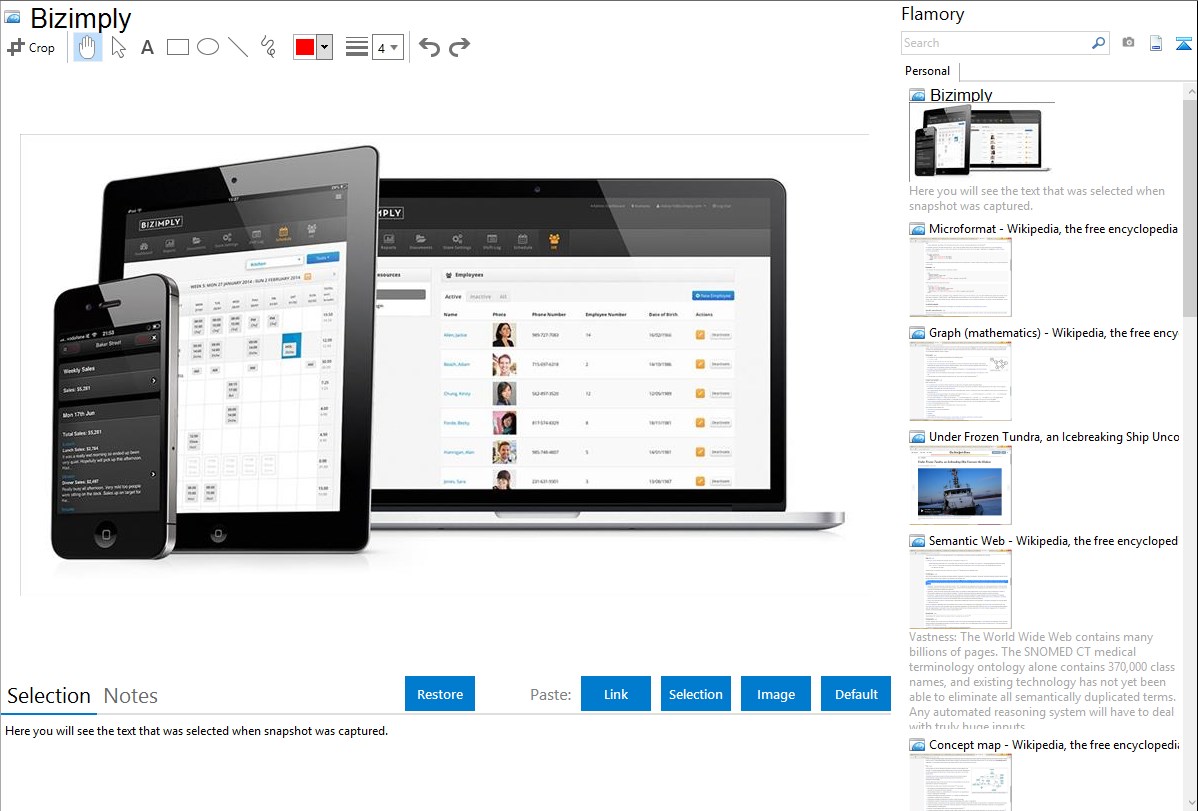 Flamory helps you capture and store screenshots from Bizimply by pressing a single hotkey. It will be saved to a history, so you can continue doing your tasks without interruptions. Later, you can edit the screenshot: crop, resize, add labels and highlights. After that, you can paste the screenshot into any other document or e-mail message.