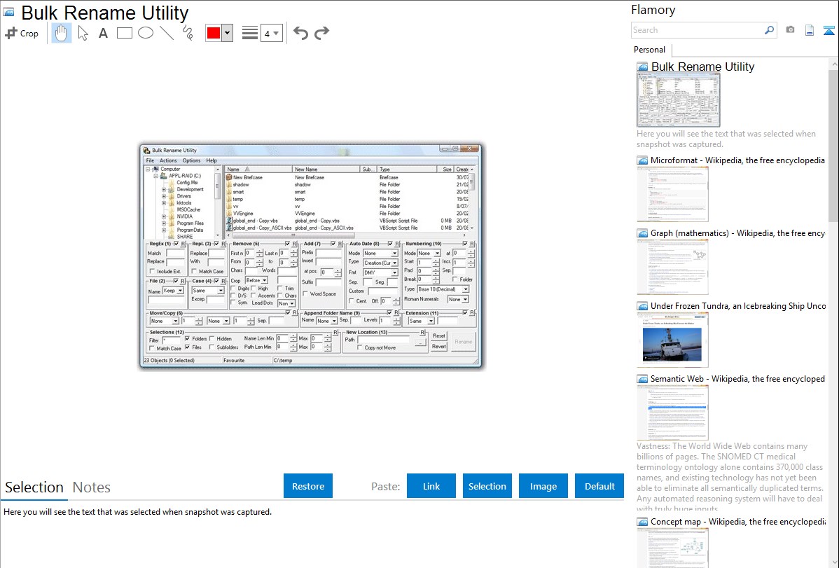 Flamory helps you capture and store screenshots from Bulk Rename Utility by pressing a single hotkey. It will be saved to a history, so you can continue doing your tasks without interruptions. Later, you can edit the screenshot: crop, resize, add labels and highlights. After that, you can paste the screenshot into any other document or e-mail message.