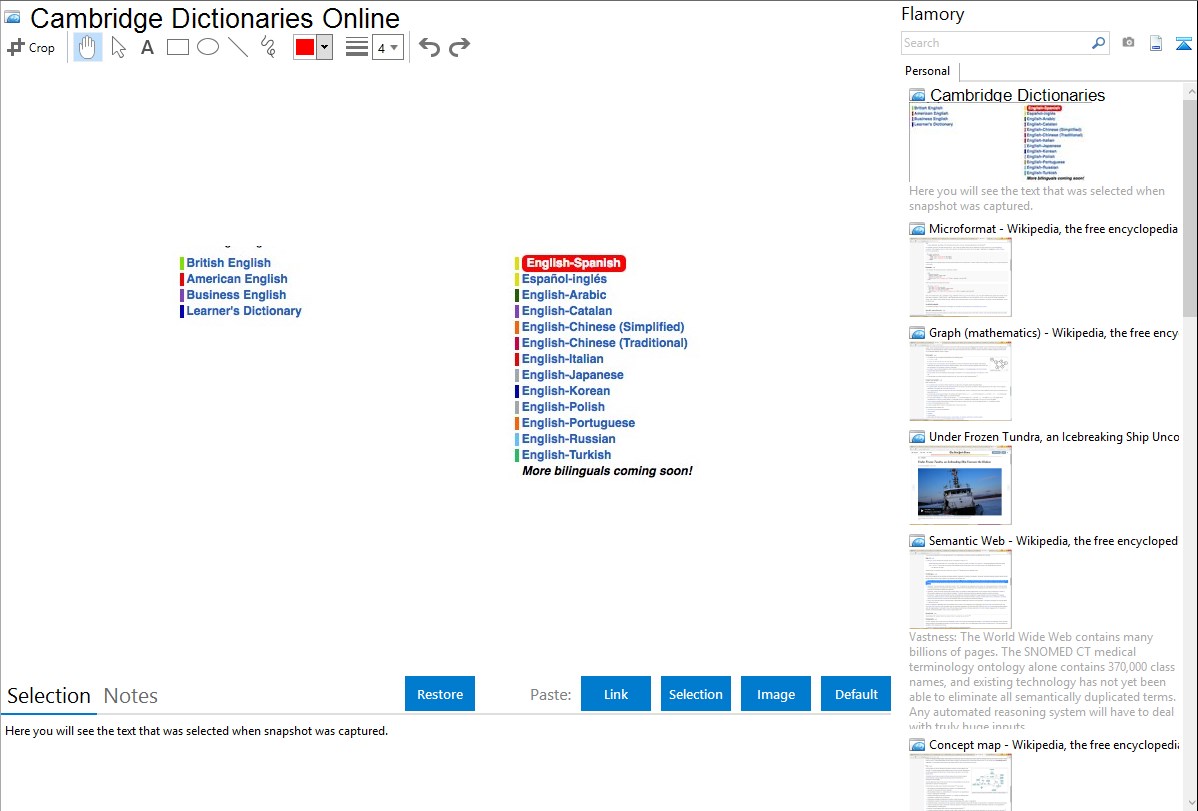 Flamory helps you capture and store screenshots from Cambridge Dictionaries Online by pressing a single hotkey. It will be saved to a history, so you can continue doing your tasks without interruptions. Later, you can edit the screenshot: crop, resize, add labels and highlights. After that, you can paste the screenshot into any other document or e-mail message.
