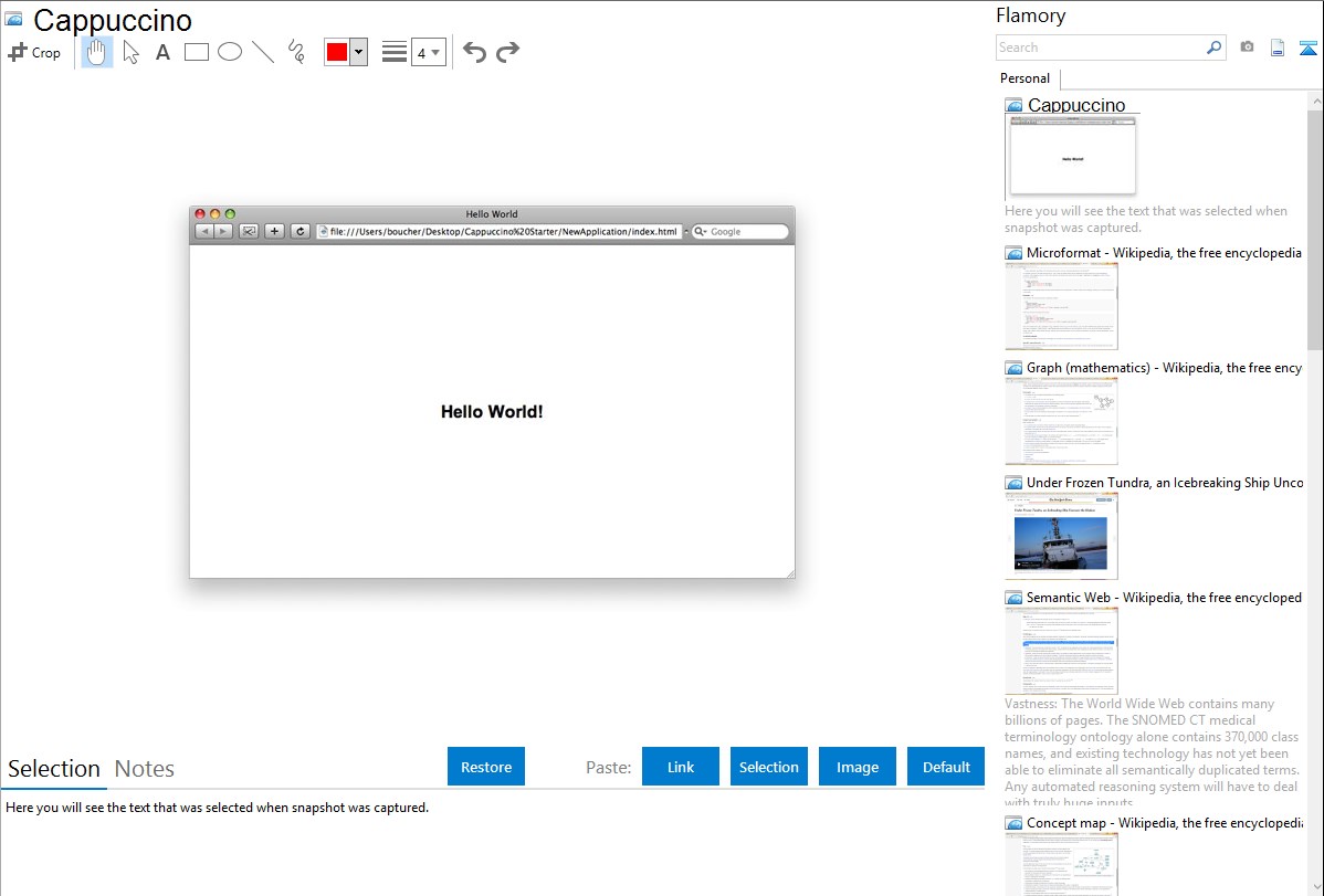 Flamory helps you capture and store screenshots from Cappuccino by pressing a single hotkey. It will be saved to a history, so you can continue doing your tasks without interruptions. Later, you can edit the screenshot: crop, resize, add labels and highlights. After that, you can paste the screenshot into any other document or e-mail message.