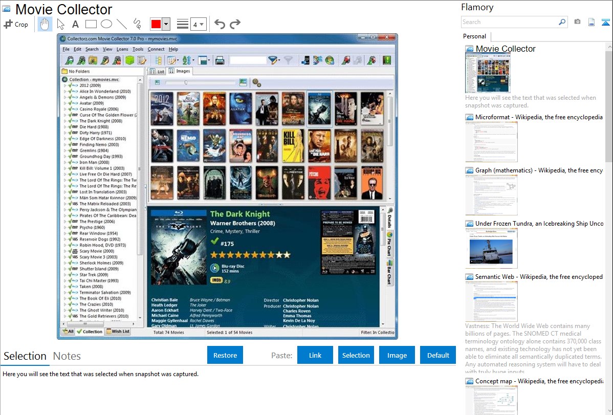 Flamory helps you capture and store screenshots from Movie Collector by pressing a single hotkey. It will be saved to a history, so you can continue doing your tasks without interruptions. Later, you can edit the screenshot: crop, resize, add labels and highlights. After that, you can paste the screenshot into any other document or e-mail message.