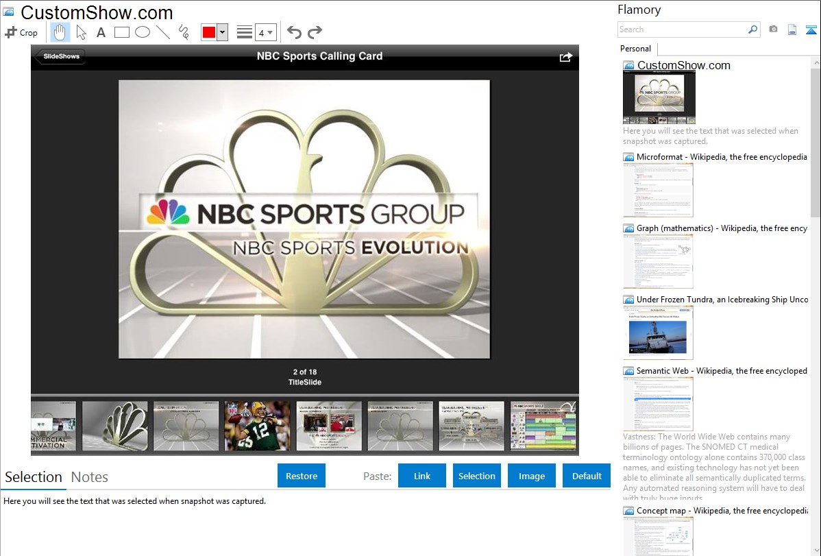 Flamory helps you capture and store screenshots from CustomShow.com by pressing a single hotkey. It will be saved to a history, so you can continue doing your tasks without interruptions. Later, you can edit the screenshot: crop, resize, add labels and highlights. After that, you can paste the screenshot into any other document or e-mail message.