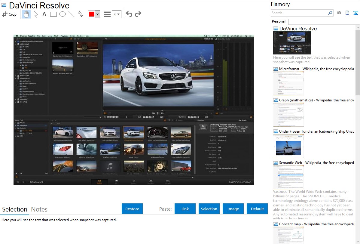 Flamory helps you capture and store screenshots from DaVinci Resolve by pressing a single hotkey. It will be saved to a history, so you can continue doing your tasks without interruptions. Later, you can edit the screenshot: crop, resize, add labels and highlights. After that, you can paste the screenshot into any other document or e-mail message.
