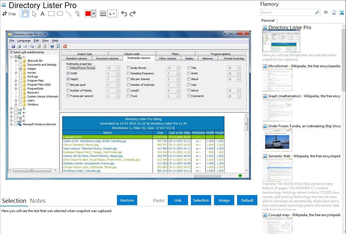 Flamory helps you capture and store screenshots from Directory Lister Pro by pressing a single hotkey. It will be saved to a history, so you can continue doing your tasks without interruptions. Later, you can edit the screenshot: crop, resize, add labels and highlights. After that, you can paste the screenshot into any other document or e-mail message.