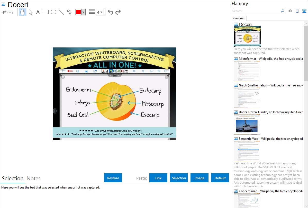 Flamory helps you capture and store screenshots from Doceri by pressing a single hotkey. It will be saved to a history, so you can continue doing your tasks without interruptions. Later, you can edit the screenshot: crop, resize, add labels and highlights. After that, you can paste the screenshot into any other document or e-mail message.