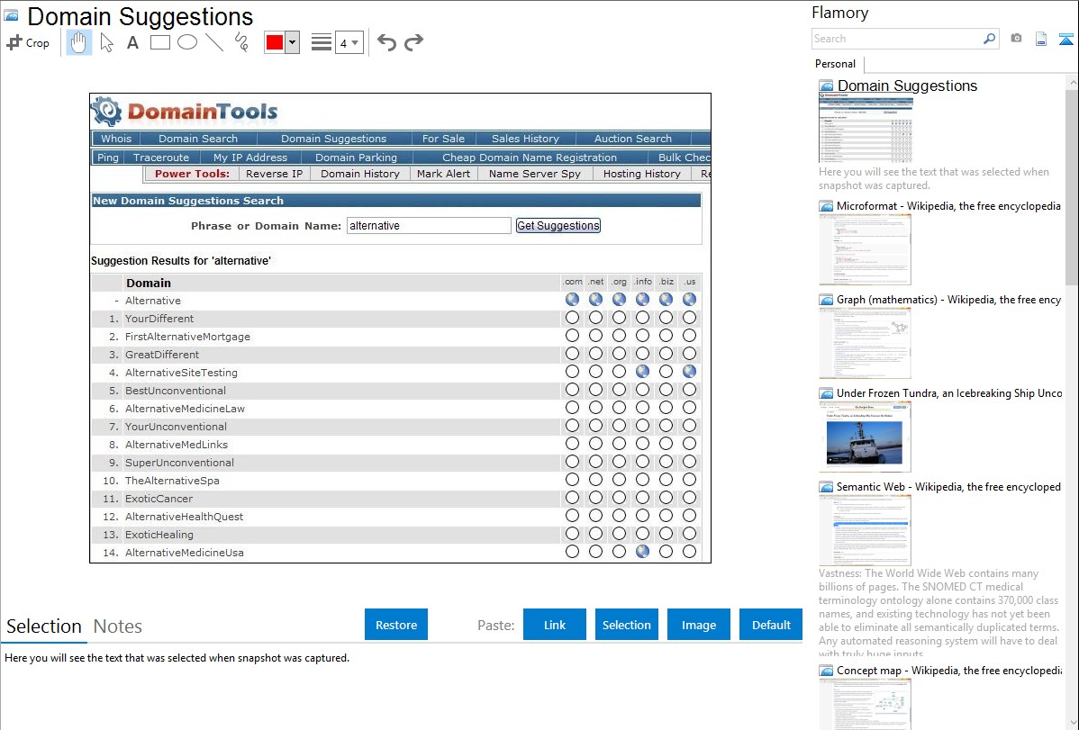 Flamory helps you capture and store screenshots from Domain Suggestions by pressing a single hotkey. It will be saved to a history, so you can continue doing your tasks without interruptions. Later, you can edit the screenshot: crop, resize, add labels and highlights. After that, you can paste the screenshot into any other document or e-mail message.