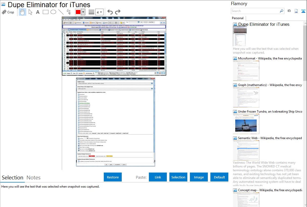 Flamory helps you capture and store screenshots from Dupe Eliminator for iTunes by pressing a single hotkey. It will be saved to a history, so you can continue doing your tasks without interruptions. Later, you can edit the screenshot: crop, resize, add labels and highlights. After that, you can paste the screenshot into any other document or e-mail message.