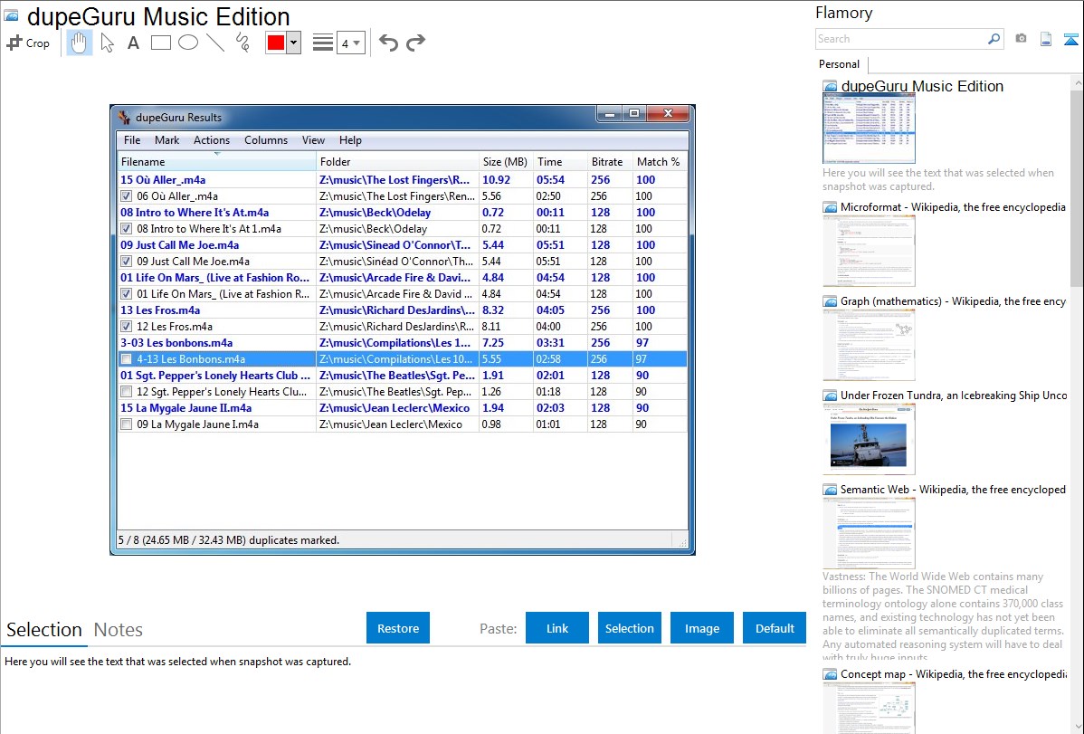 Flamory helps you capture and store screenshots from dupeGuru Music Edition by pressing a single hotkey. It will be saved to a history, so you can continue doing your tasks without interruptions. Later, you can edit the screenshot: crop, resize, add labels and highlights. After that, you can paste the screenshot into any other document or e-mail message.