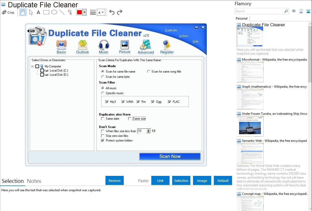 Flamory helps you capture and store screenshots from Duplicate File Cleaner by pressing a single hotkey. It will be saved to a history, so you can continue doing your tasks without interruptions. Later, you can edit the screenshot: crop, resize, add labels and highlights. After that, you can paste the screenshot into any other document or e-mail message.