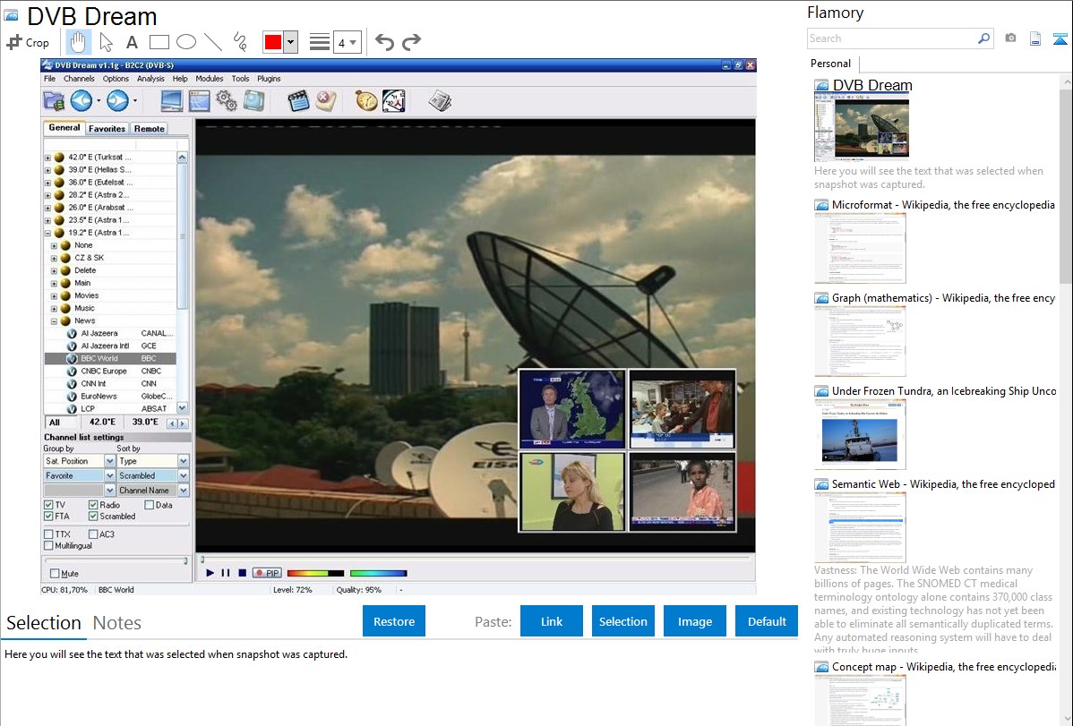 Flamory helps you capture and store screenshots from DVB Dream by pressing a single hotkey. It will be saved to a history, so you can continue doing your tasks without interruptions. Later, you can edit the screenshot: crop, resize, add labels and highlights. After that, you can paste the screenshot into any other document or e-mail message.