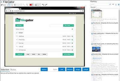 Flamory provides advanced bookmarking for FileGator. It captures screen, selection, text on the page and other context. You can find this bookmark later using search by page content or looking through thumbnail list.