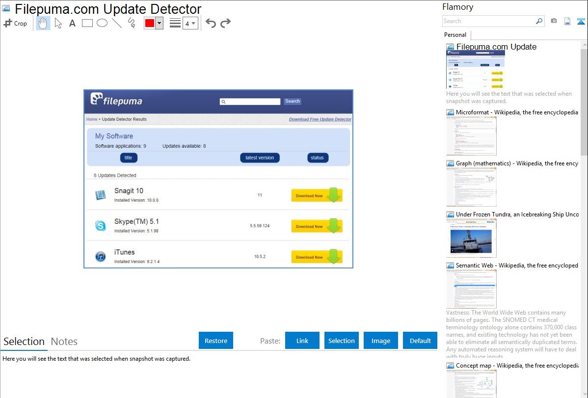 Flamory helps you capture and store screenshots from Filepuma.com Update Detector by pressing a single hotkey. It will be saved to a history, so you can continue doing your tasks without interruptions. Later, you can edit the screenshot: crop, resize, add labels and highlights. After that, you can paste the screenshot into any other document or e-mail message.