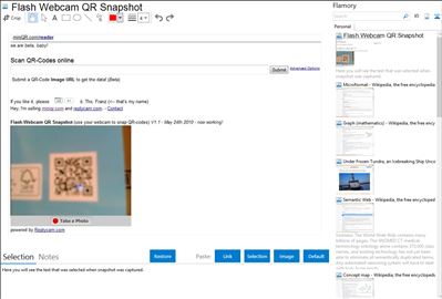 Flamory provides advanced bookmarking for Flash Webcam QR Snapshot. It captures screen, selection, text on the page and other context. You can find this bookmark later using search by page content or looking through thumbnail list.